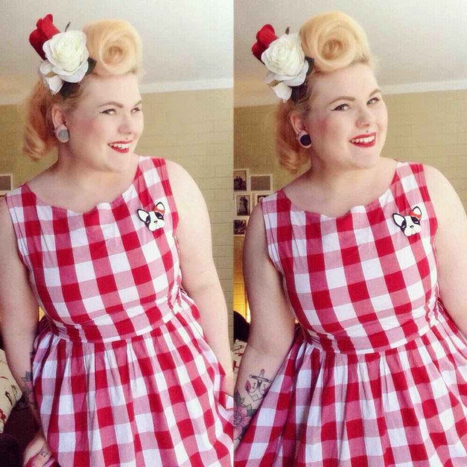 I actually didn't realize how much of my wardrobe it goes with! Especially my Lindy bop Audrey checked dress above. Its like a match made in heaven. I just loves how its sits in my hair! I have had a problem with some flowers in the past that they just don't grip well in my hair because of either the hair clip isn't great quality or its just to heavy. There is neither of those problems here. It sits nice and snug in my hair all day, even with constant walking and bouncing a baby up and down. It also doesn't hurt my scalp when putting in (had that problem too) or damage my hair.